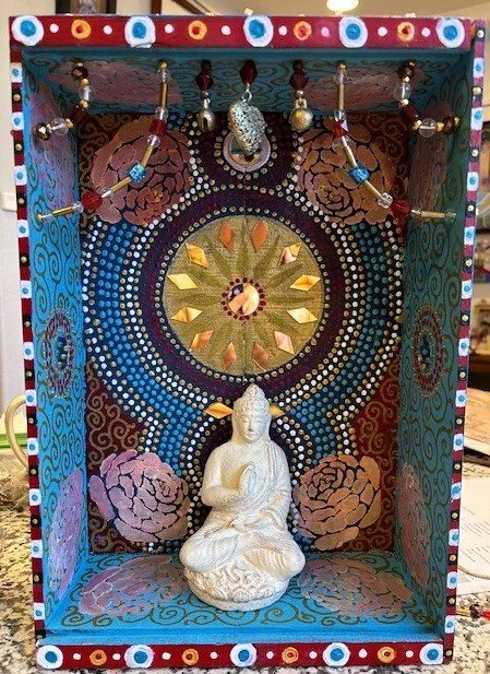 This thrift shop berry box was too good to pass up. I took it home and gave it some love. I added paint, mirrors (diamond shaped and round), glass beads, found object charms and brass bells, and paint! Add your own Buddha statue, Ganesha, Cross, or a Prayer Bowl inside. Use only electric candles. Smoke from real candles will damage the surface. Outside of the box is a plain turquoise color. One side is warped a bit, but is sturdy and in good shape. It’s what is inside the box, inside us, that matters! FREE SHIPPING! As Is.